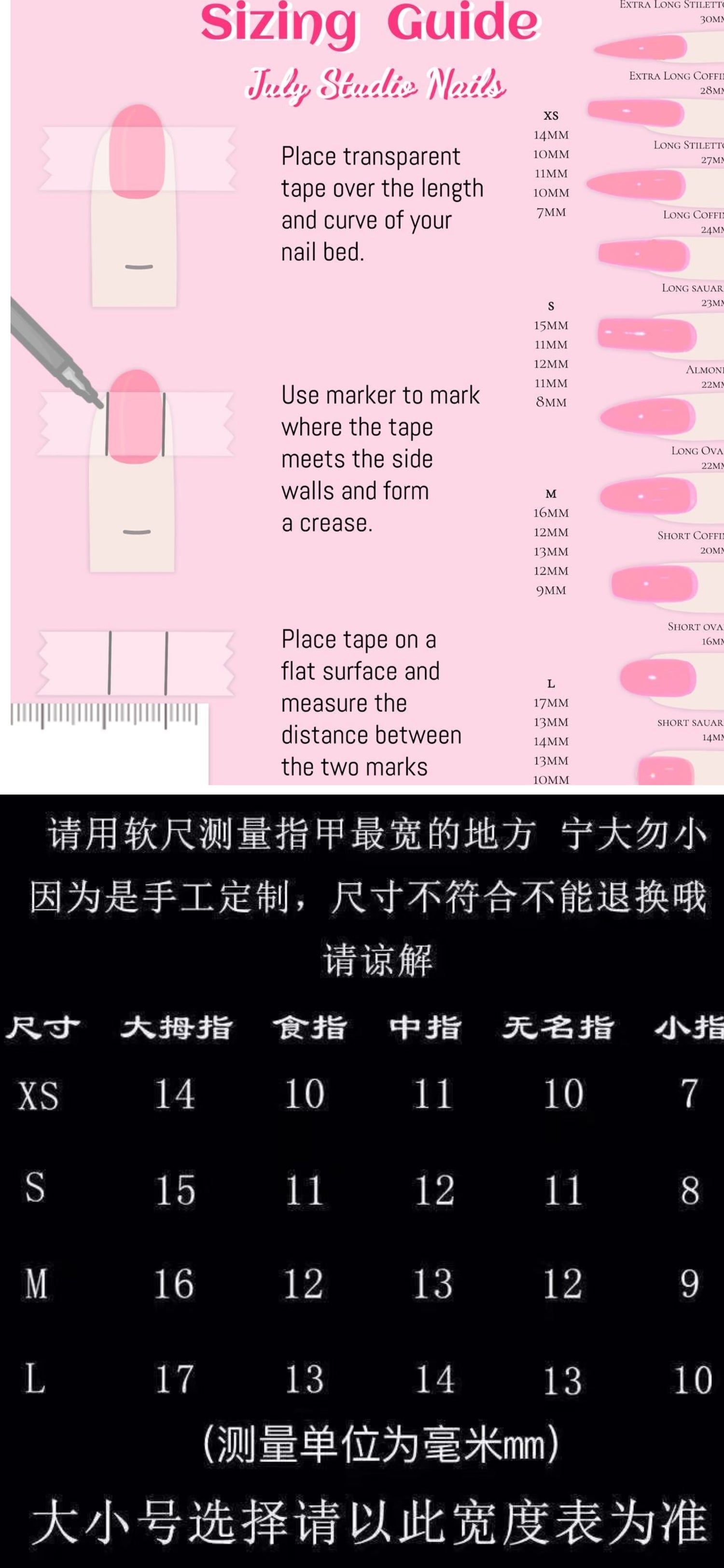 Thanks everyone to choose us,all the nails by handmade, and we promised you the order will shipped in 24-48h,if you have any questions pls feel free to contact us,wechat:julystuidoinla ,ins:july_studiooo, thanks again .enjoy your nails trip.