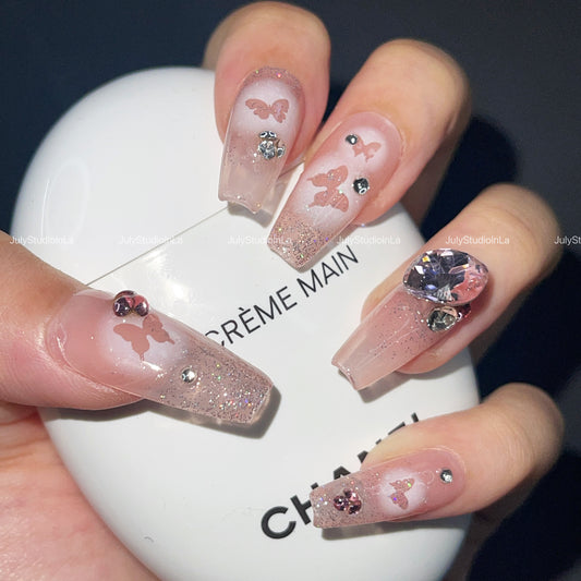 Blue silver Y2K butterfly medium coffin shining press on nails
