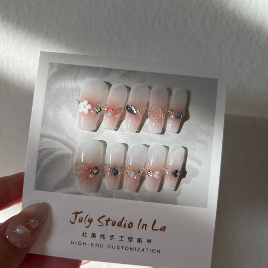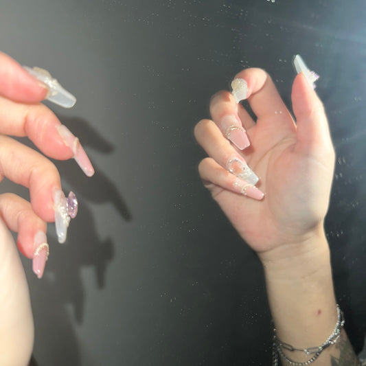 LONG COFFIN | WHITE PINK BLUSH| 3D FLOWER AND SHINNING DIAMOND