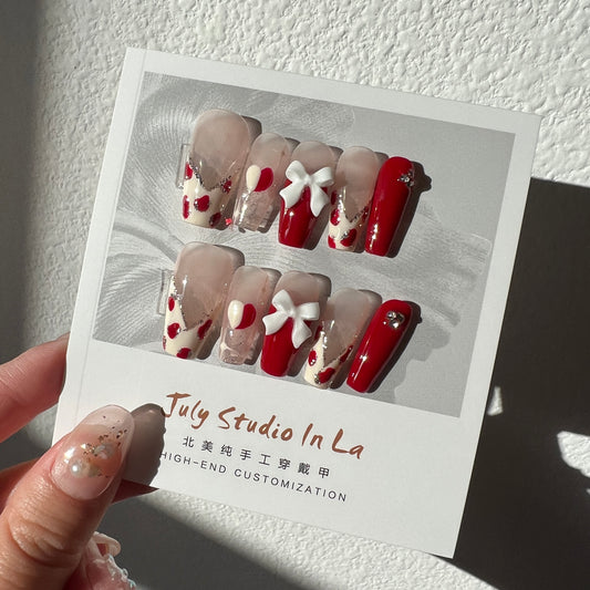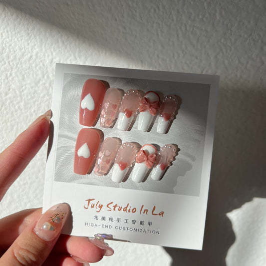LONG COFFIN| PINK WHITE NAILS| LOVE HEART WITH BOW