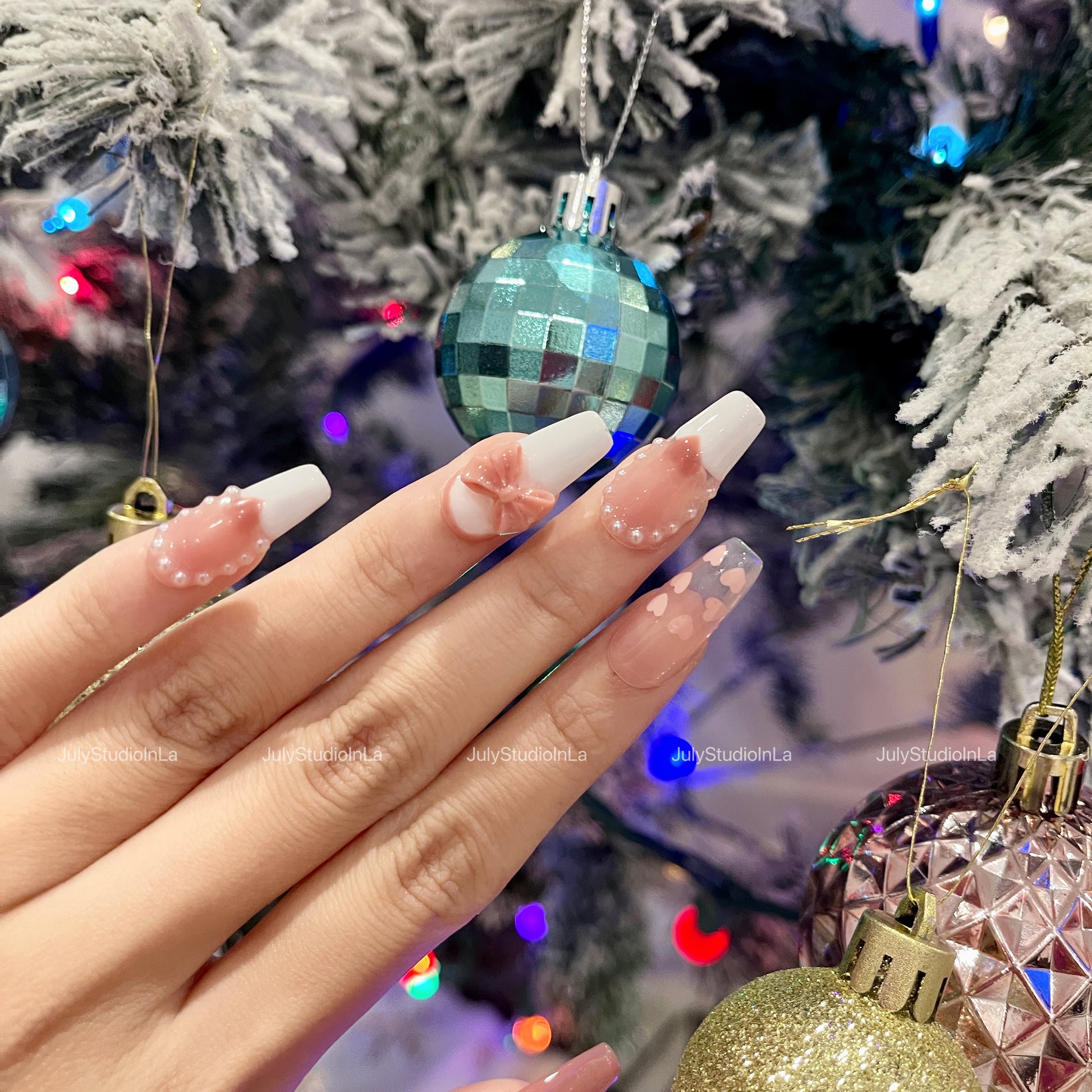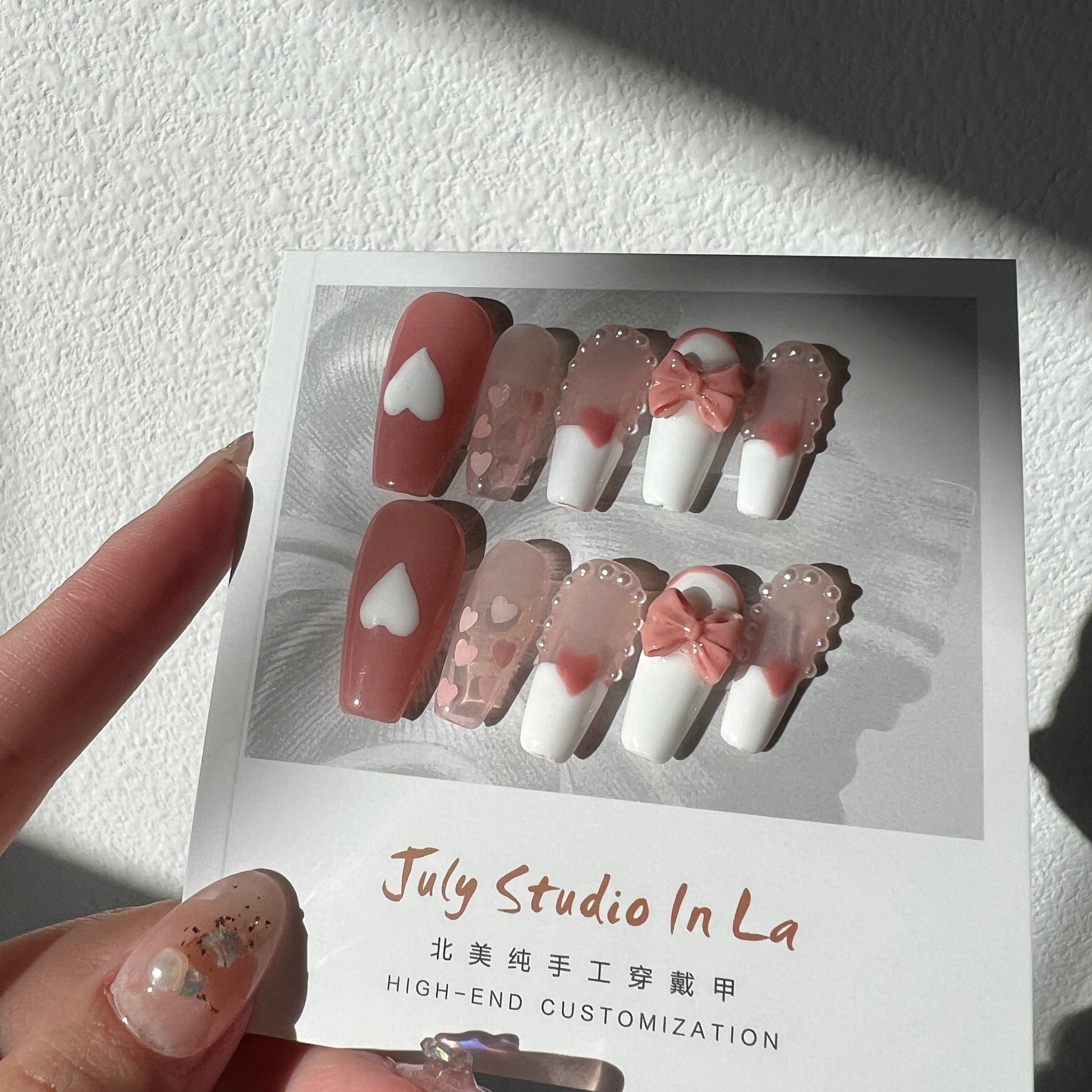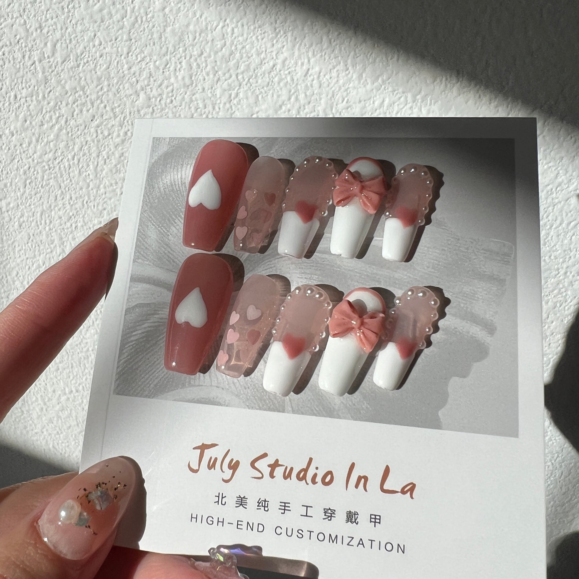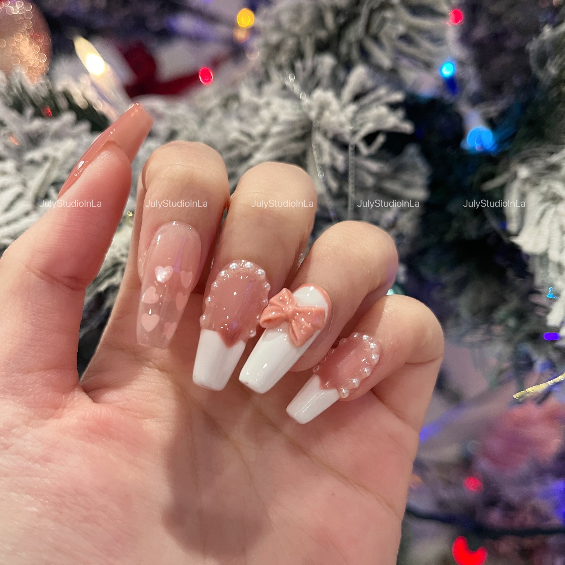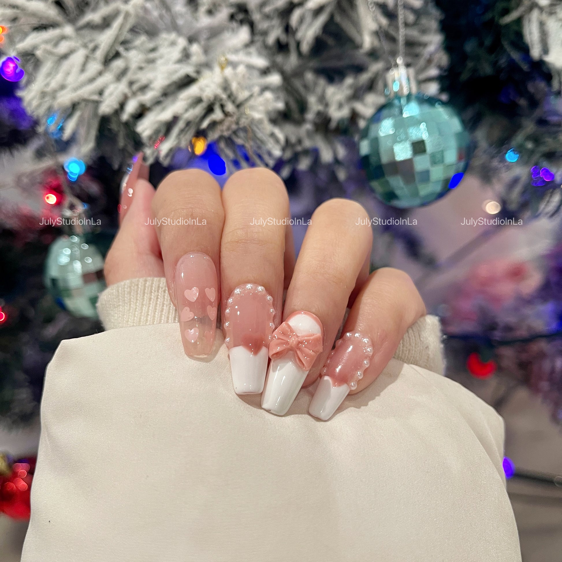 LONG COFFIN| PINK WHITE NAILS| LOVE HEART WITH BOW